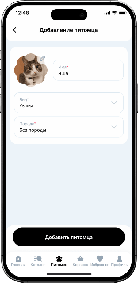 Функционал позволяет добавить имя и породу животного, а также загрузить фотографию питомца