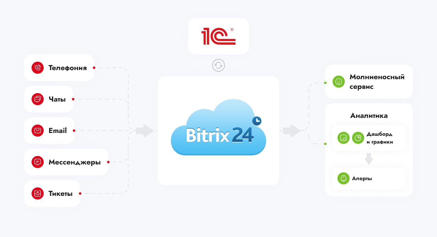 мессенджеры и тикеты. Карточка мгновенно обогащается данными из 1C.
