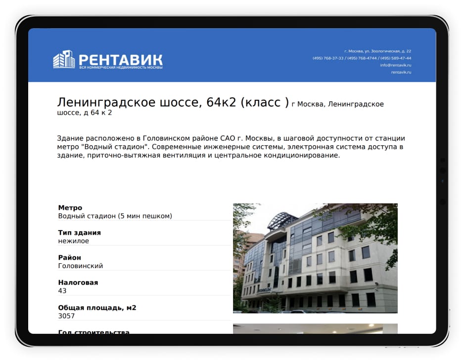 Предоставляет полную информацию об объекте аренды: фото, описание, характеристики, расположение на карте, контактные данные для связи с владельцем. Все, что нужно арендатору для принятия решения.