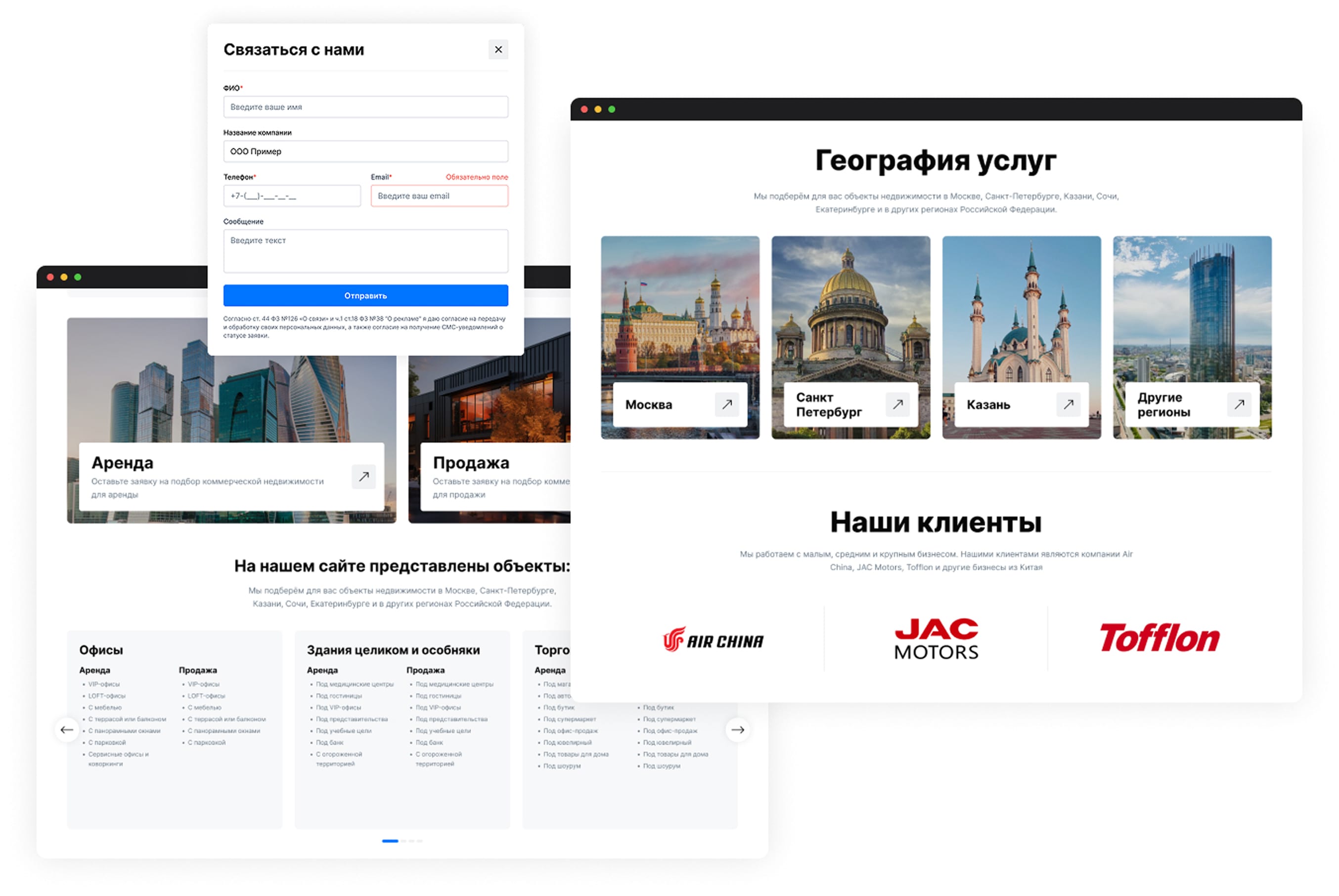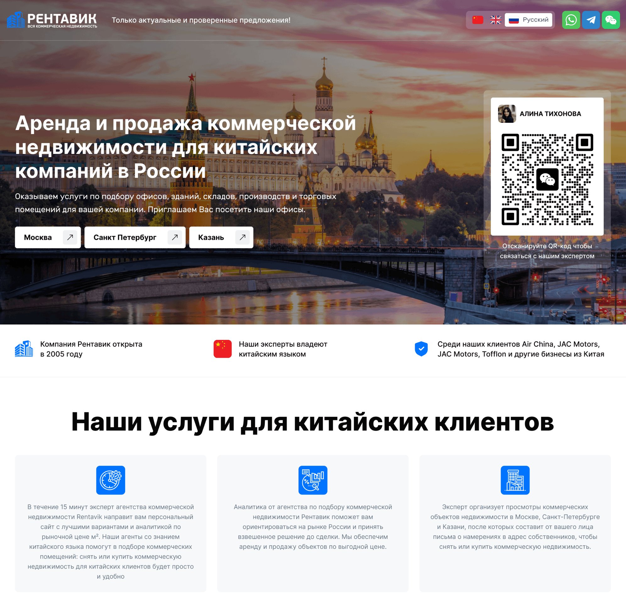 Платформа позволяет создавать специализированные сайты для разных направлений работы компании, например, недвижимость для китайских компаний, аренда лофт